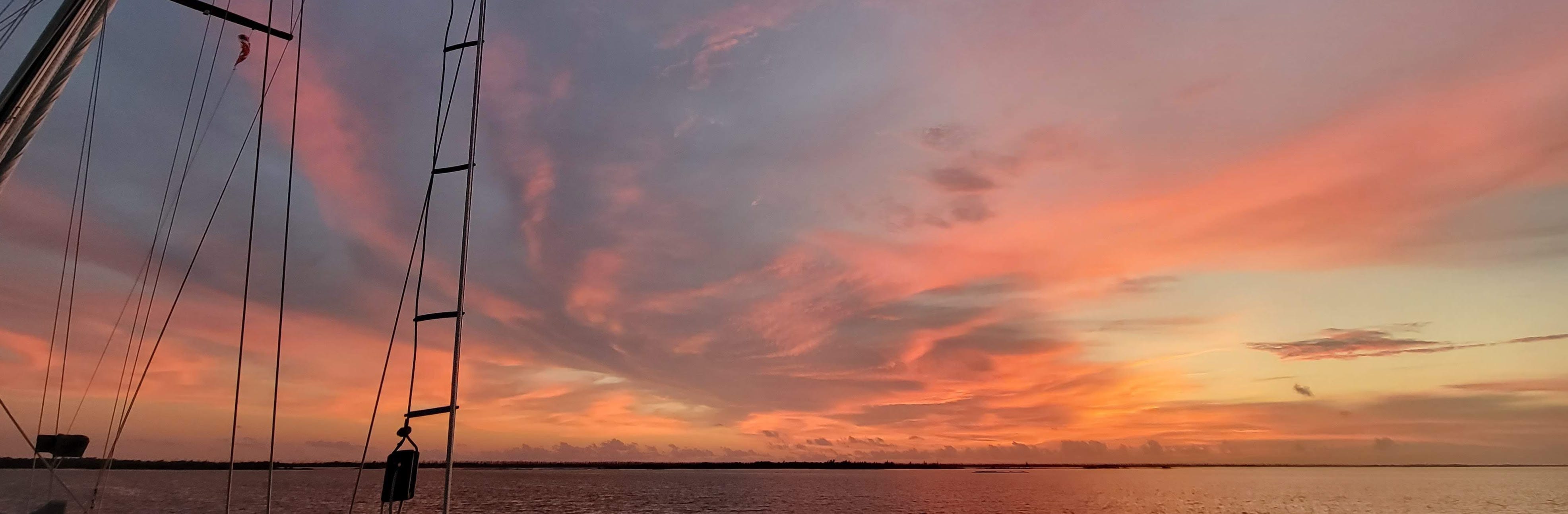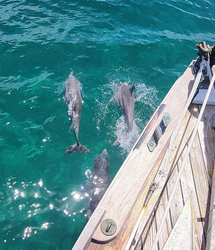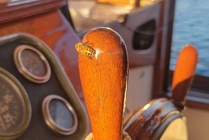 They are great examples of why I choose to live the way I do. More dear to me than the stunning sunsets, honestly, are moments like these, when my heart races as I hang over the bow and meet the eyes of a dolphin, one at a time, as that amazing mammal observes me. Or when a honeybee makes the inexplicable long-distance overwater flight to investigate the helm. Maybe it was his milestone, to get that far.
