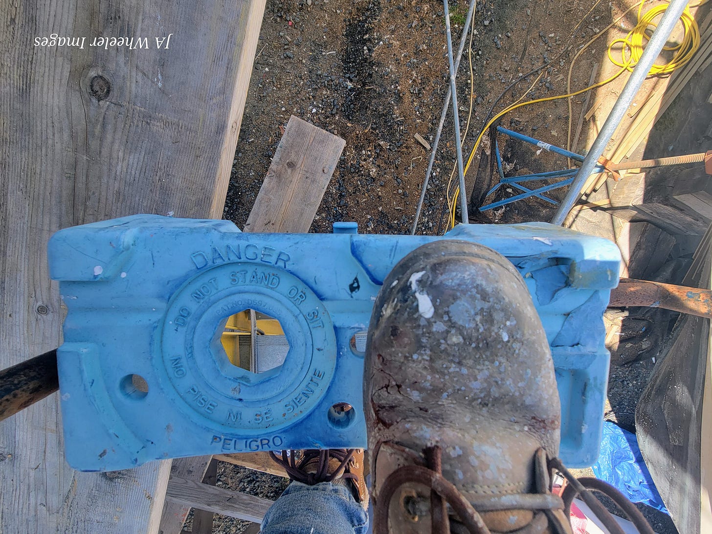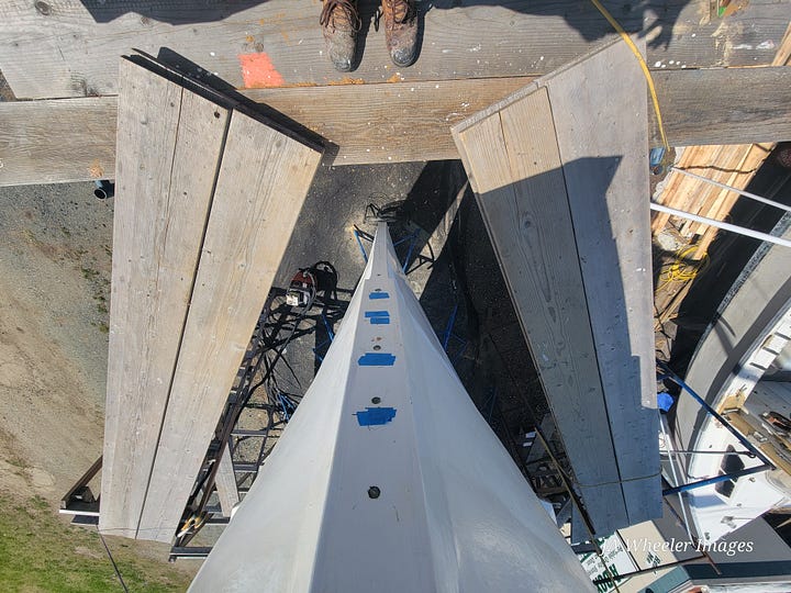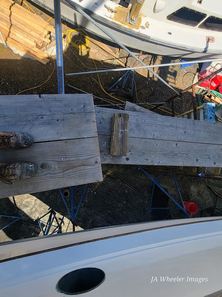 The worksite path containing this ladder has been traversed thousands of times and there will be hundreds more before we’re done. Here’s how it goes: with your right foot on the danger icon, you swing your left leg way up, over the top of the scaffold, down onto a crossboard, then three steps across onto a wobbly, borrowed keel block to boost you two more feet up to the top, the level with the most risk, perhaps, and then you walk out to either side of the bow, usually against the wind, always acutely aware of the stunning force of gravity. Usually, at least one of your hands is full and it’s often something expensive and/or sharp; on a really dangerous day, it’s both.