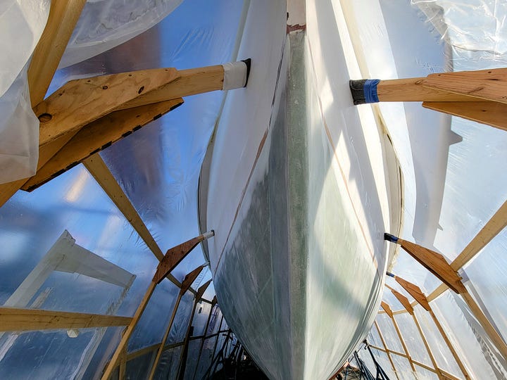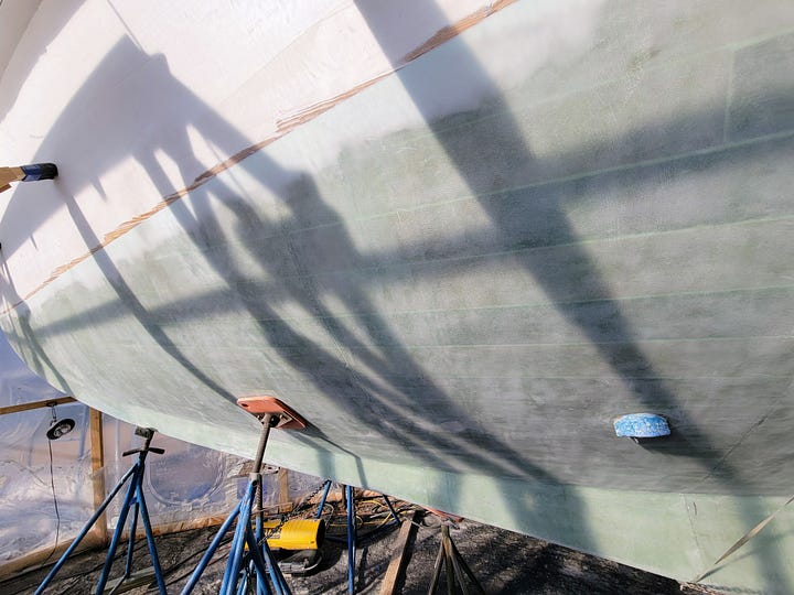 “I’m quitting after this last three feet,” he told me above the din of the air compressor, grinder, fans, and constant, mellow classic rock at the highest volume the thirty year-old speakers will handle. The sailor was sanding the sunny side waterline so that it didn’t cure too much and make that task (even more) difficult. A whole lot of curving surfaces come together at STEADFAST’s waterline, a whole lot of forces, both inside and out, and you already saw that he did, in fact, smooth our bottom. A thick, intimidating layer of snow-white fiberglass dust covered every imaginable surface.