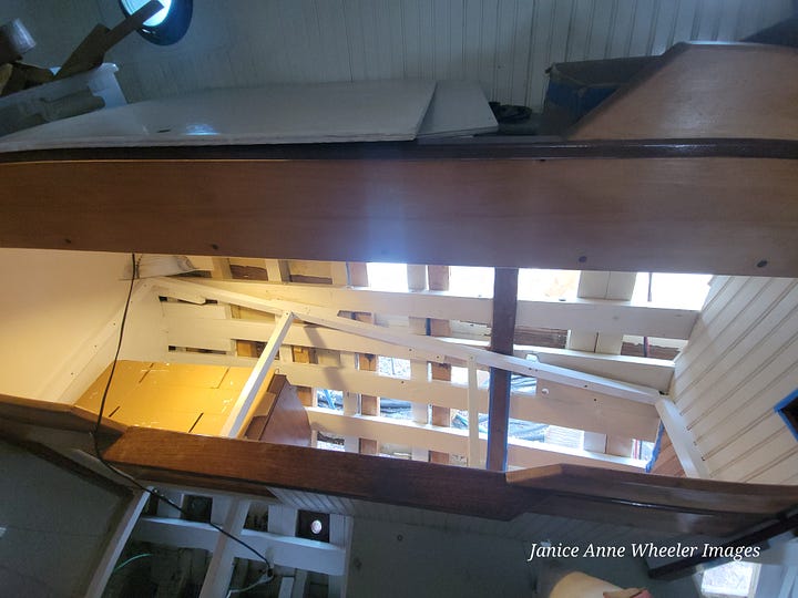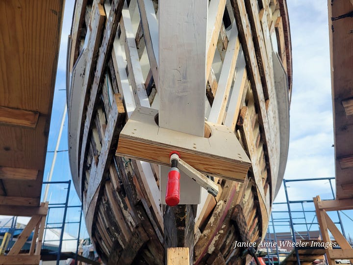 I nodded with an unexpected wave of emotion, blown in through the doorway like the biting north wind. That evening, after an exquisite hot shower (our joys are simple), I sat down on this very Mac and delved into the thousands of photos I’ve taken with both Canon and phone over the last twelve months. It occurs to me, each time I do this, how complex, layered and impressive big wooden vessels can be; there is so much hidden beneath the planking. So many steps, so much time. Here’s the bow one year ago and yesterday. Nineteen months ago today, we investigated the tiny brown spot that led us here.