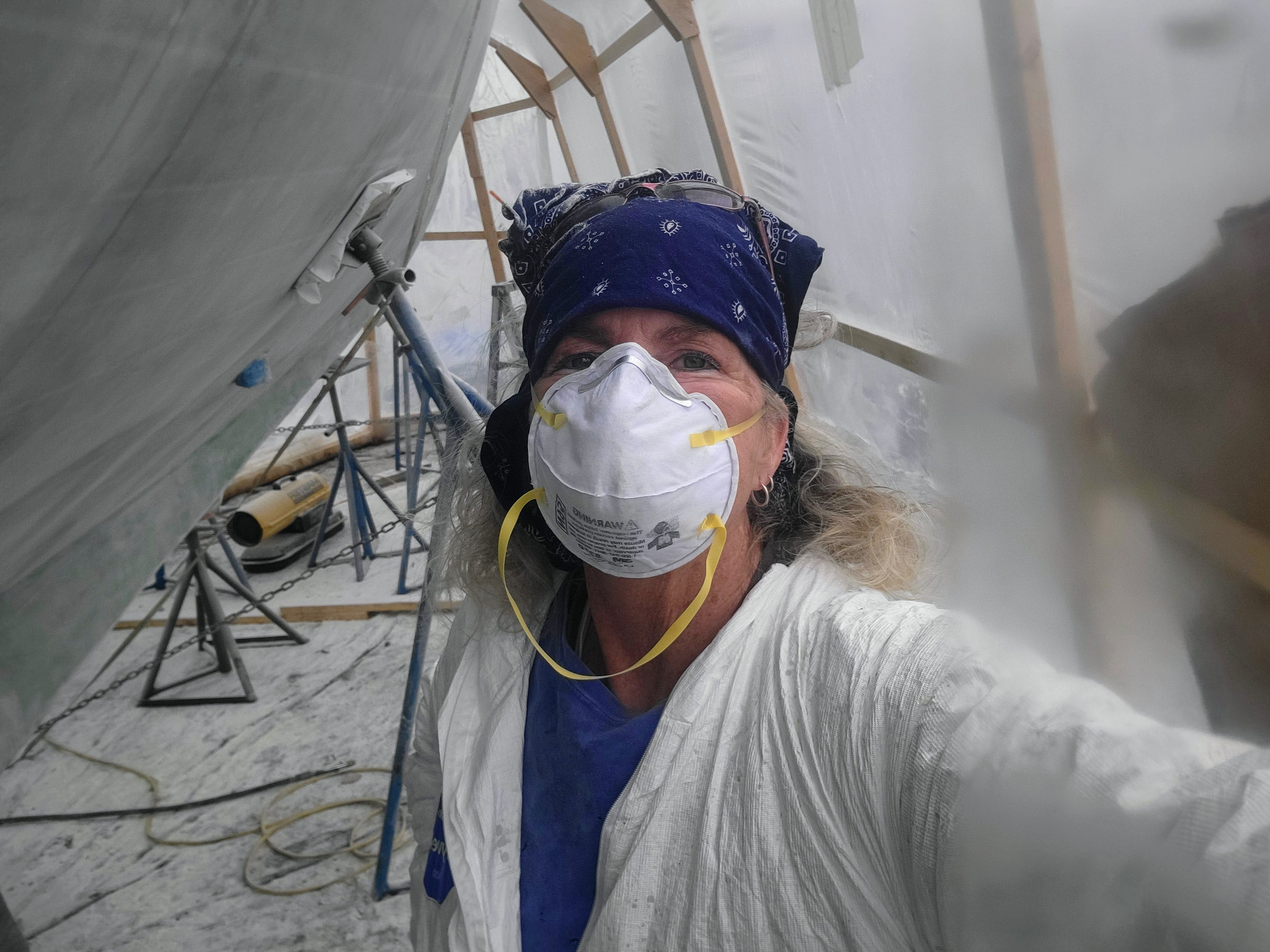 “I feel lazy,” I called through the plastic. People, myself included, pay money to meditate, do nothing, relax, reflect and regroup. On this particular day, I wasn’t comfortable. I had just dropped lunch down the line used for that purpose, descended the ladder and sat in my now-a tad-rickety teak rocker, but I wasn’t working as I have come to know boatwork. I don’t grind the fiberglass to its desired finish; that careful work is not in my skillset nor my job description and Steve was just as dusty and worn out, maybe even more so, than I was last week when we finished the application. “That stuff is awful,” I had told him, stripping off my TYVEK suit for what I thought would be the final time. I shouldn’t have lamented having nothing urgent to accomplish; as soon as he finished, my work began in the doo-rag of the week.