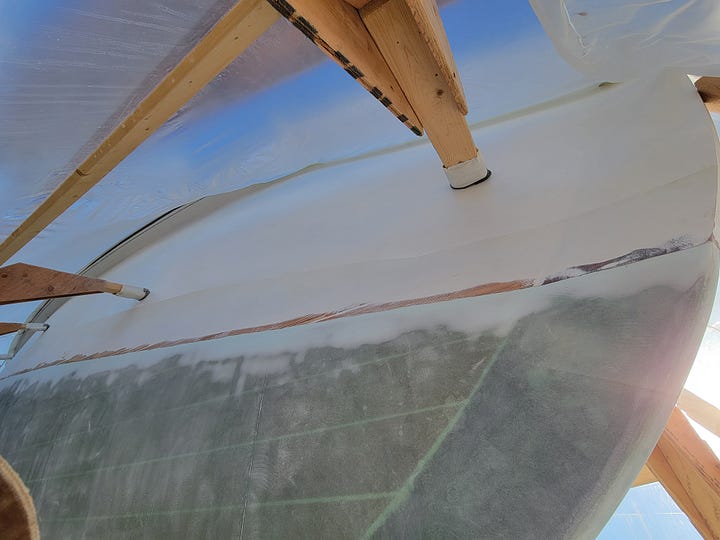 My workboots were propped up on the sawhorse which is used as a table and as legs and a sawhorse and a roller for the planer. Pretty handy, that thing. Purchased at the beginning of this land-dwelling adventure for 34.95 from some horrifyingly big box store so we didn’t have to make them ourselves; after all, we weren’t going to be here very long. There’s a little burro emblazoned on one corner. Not a horse, a burro. For a moment, I ponder why and then I ponder why on God’s green earth that could possibly matter and direct my gaze elsewhere. On the very long list of things that don’t matter, that could be right near the top. I then contemplate a fleck of fiberglass resin on my sunglasses that I fear is irremovable and will need to be ignored. Epoxy resin is as permanent as permanent gets and any attempt at removal would surely lead to extra scratches and a curse or two. Of course, that’s the whole point of this project, isn’t it? To make STEADFAST as permanent as she can possibly be. To make her outlast me, the Sailor and most of you perusing this story.
